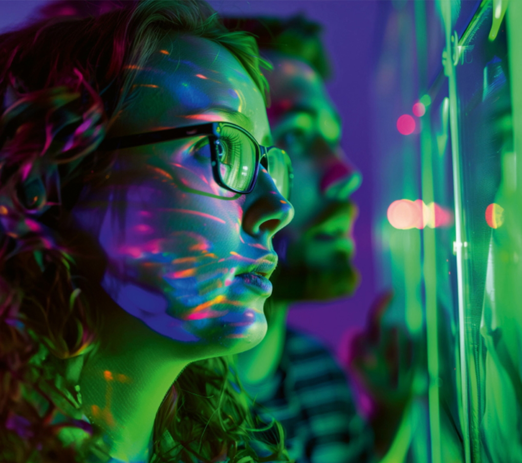 In einem ersten Schritt generierten wir mit Midjourney ein Sujet, das sowohl die Farbgebung wie auch den typischen Bildstil der PHSG berücksichtigte. Einige Prompts später schauten junge Menschen gebannt auf eine futuristisch anmutende Installation. Details bearbeiteten wir anschliessend mit der generativen Bildbearbeitung von Photoshop, bevor wir mithilfe von AI das von der Kundin favorisierte Sujet in die verschiedenen Formate brachten.