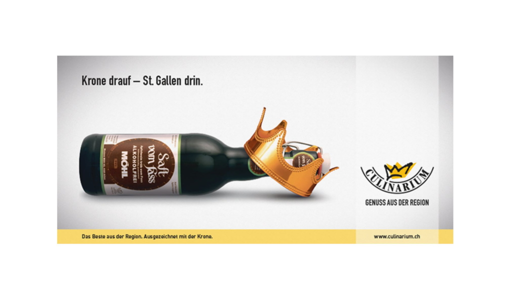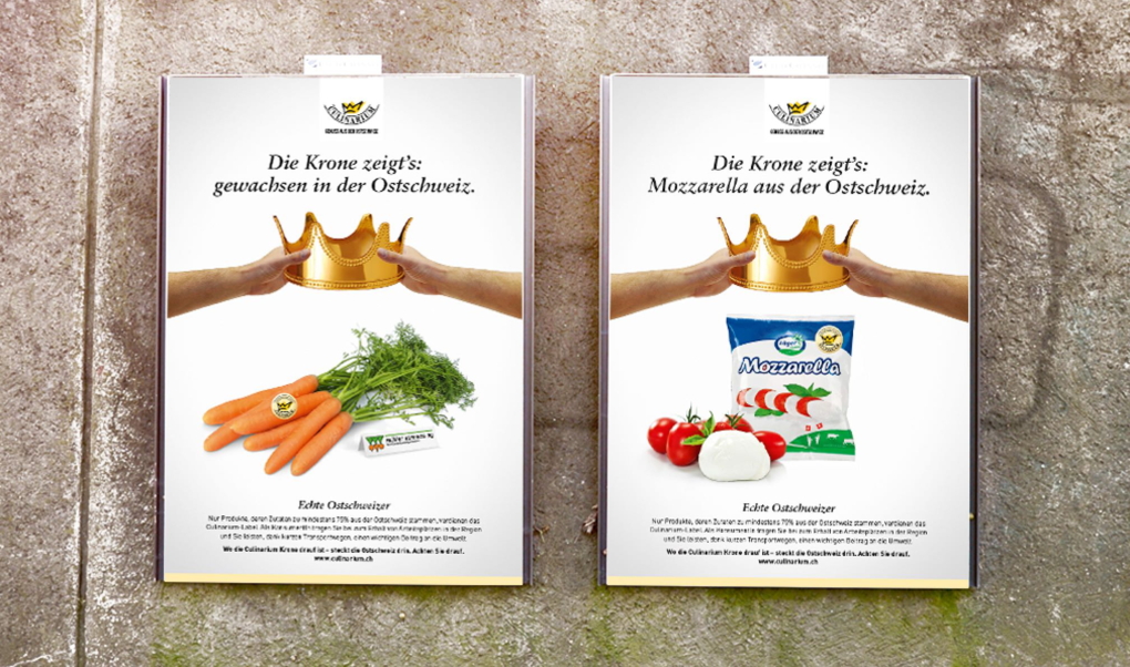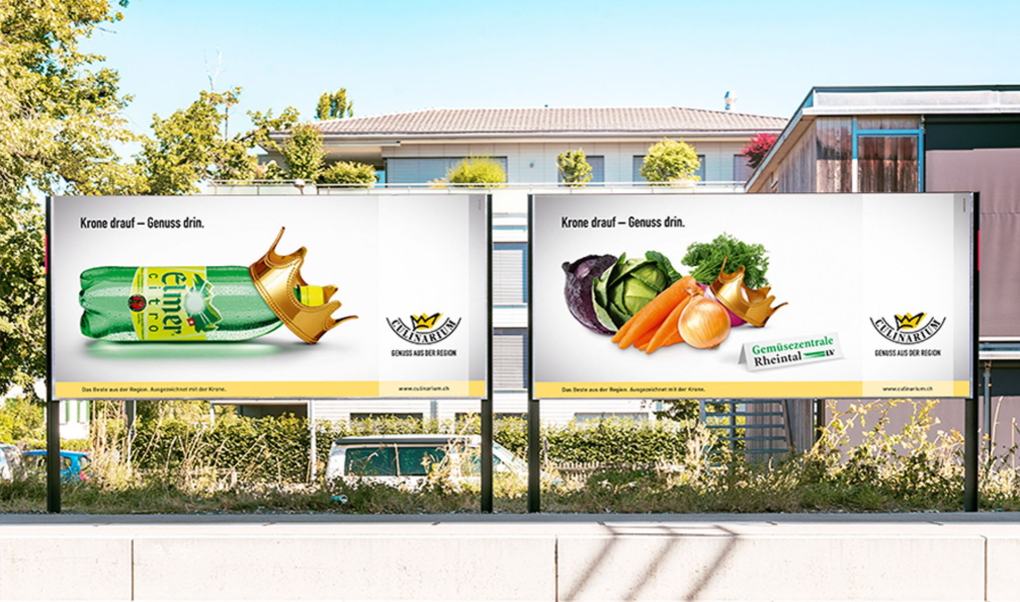 Um die Bekanntheit der Marke Culinarium zu steigern, wurde Rembrand mit der Konzeptentwicklung und Realisierung einer Plakat- und Inseratekampagne betraut. Ganz nach dem Motto «Krone drauf – Genuss drin» haben wir ausgewählte Produktmotive mit der goldenen Krone geschmückt. Damit wird auch die Positionierung des Vereins als Förderer von regionalen Produkten und Spezialitäten ins Zentrum gerückt.