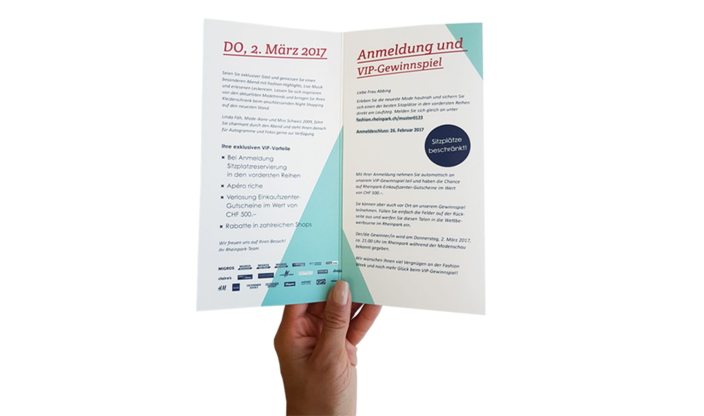 Die Fashion Week in den Einkaufzentren der Migros Ostschweiz ist jedes Jahr ein besonderes Highlight. Rembrand ist für die gesamte Eventkommunikation verantwortlich und lockt damit erfolgreich das modebegeisterte Publikum an. Mitglieder der Einkaufszenter-Community werden mit personalisierten E-Mailings eingeladen und können auf einer personalisierten Landingpage für sich und ihre Freunde die begehrten und limitierten Sitzplätze sichern und an den zahlreichen Verlosungen von Einkaufsgutscheinen teilnehmen.