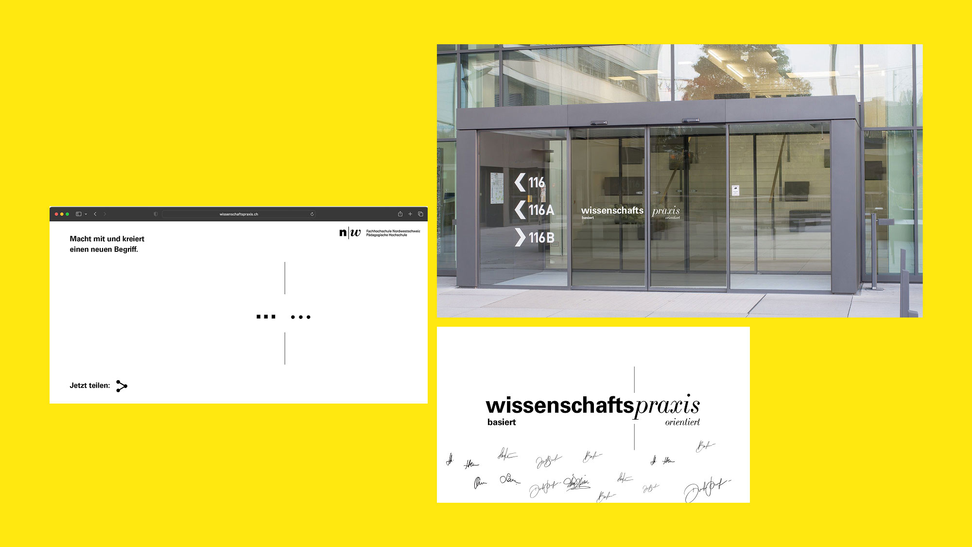 Die Verbindung von Praxis und Wissenschaft wurde optisch dargestellt, indem die Kombination von zwei Schlagwörtern ein neues Wort bildete. Denn die angehenden Lehrpersonen müssen adaptiv und flexibel mit ihrem Wissen umgehen. Noch plakativer ist die Idee des gelb-hinterlegten Weges zusammen mit dem Claim «Ein erstklassiger Weg macht Schule», für den sich die Kundin letztendlich entschied.