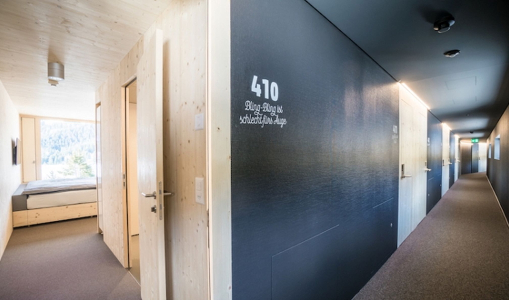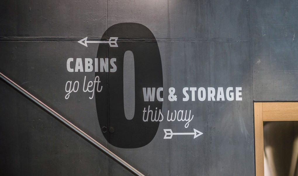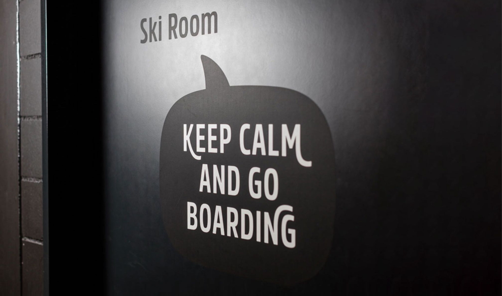 In der relaxten Atmosphäre des Reviers fühlt man sich instinktiv wohl. Dazu trägt auch die Signaletik bei. Ziel sämtlicher Beschriftungen ist es, mit den Gästen in einen Dialog zu treten und sie dazu zu bewegen, die öffentlichen Räume des Reviers mit anderen gemeinsam zu nutzen. Lockere Sprüche mit einem kleinen Augenzwinkern begleiten den Auftritt. Von den einzelnen Zimmertüren bis hin zum Ski Room – hier entdeckt man Sprüche mit viel Witz und Charm eingebettet in ein Signaletikkonzept, das perfekt zur Zielgruppe passt.